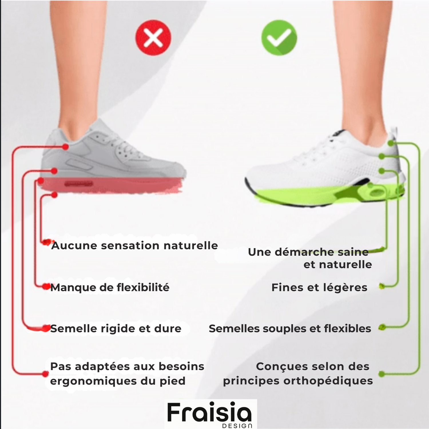 Les semelles rigides et les chaussures peu flexibles peuvent provoquer des douleurs nerveuses et ne soutiennent pas les mouvements naturels du pied.